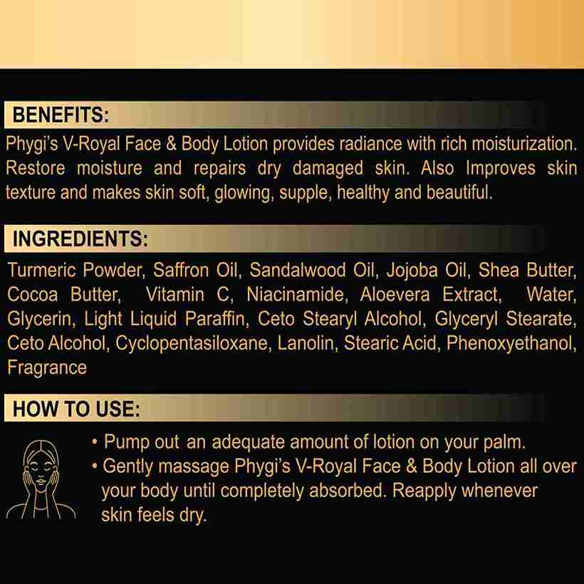 Phygi's V-Royal Face & Body Lotion provides radiance with rich moisturization. It restores moisture and repairs dry, damaged skin. Also improves skin texture and makes the skin supple, glowing, healthy, and beautiful.