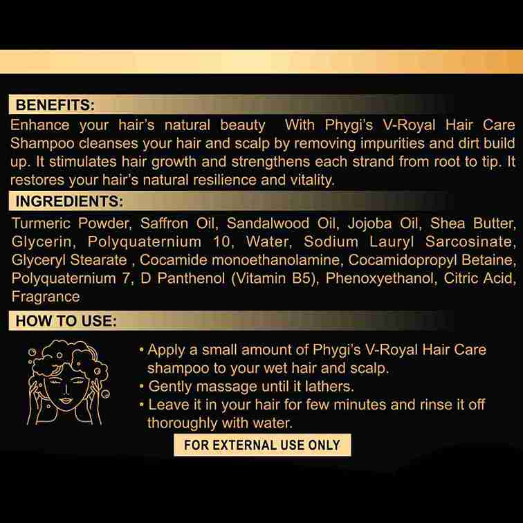 Enhance your hair's natural beauty with Phygi's V-Royal Hair Care Shampoo . It cleanses your hair and scalp by removing impurities and dirt build up. It stimulates hair growth and strengthens each strand from root to tip. It restores your hair's natural resilience and vitality.