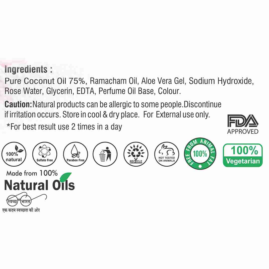 | Pure Coconut Oil - 75%, Ramacham Oil, Aloe vera gel, sodium hydroxide, Glycerine, Rose Water, EDTA, Pefume Oil Base, Colour |