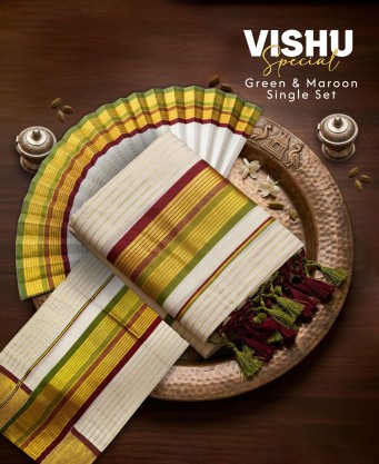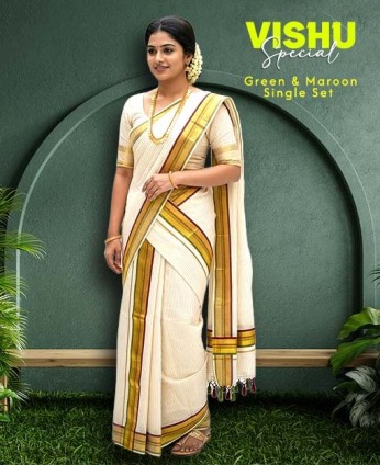 A perfect blend of tradition and elegance, featuring classic kasavu design with rich green and maroon borders.